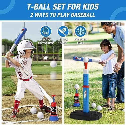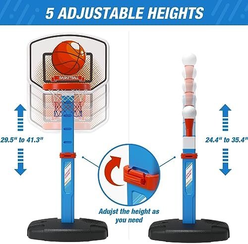 5 ADJUSTABLE HEIGHTS – Accompanying your child’s growth. The height of basketball hoop can be adjusted from 29.5in to 41.3in, while the height of baseball stand can be adjusted from 24.4in to 35.4in. You can put it low when your baby wants to dunk on it, or put it high when he wants to shoot and practice his skills.