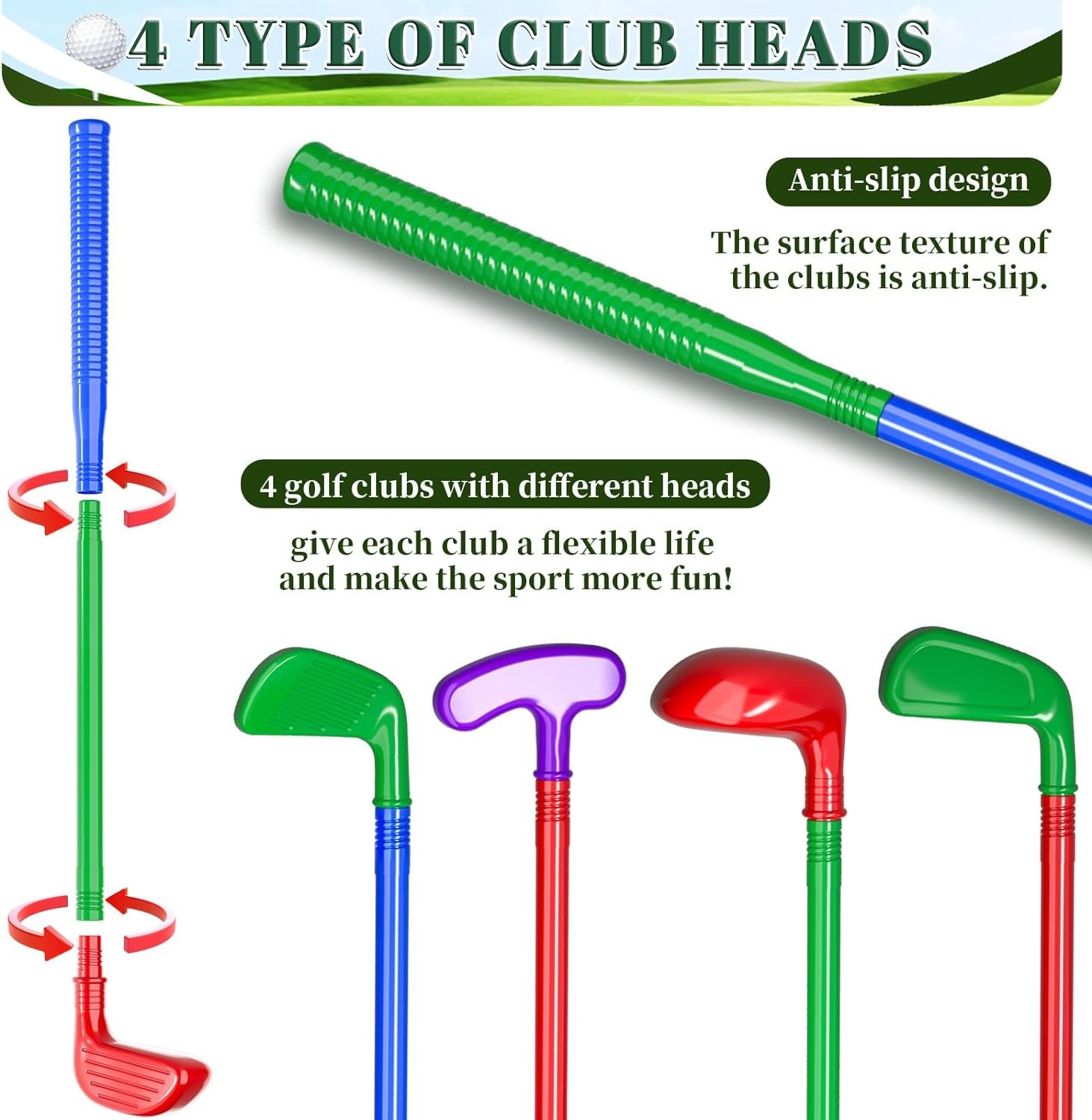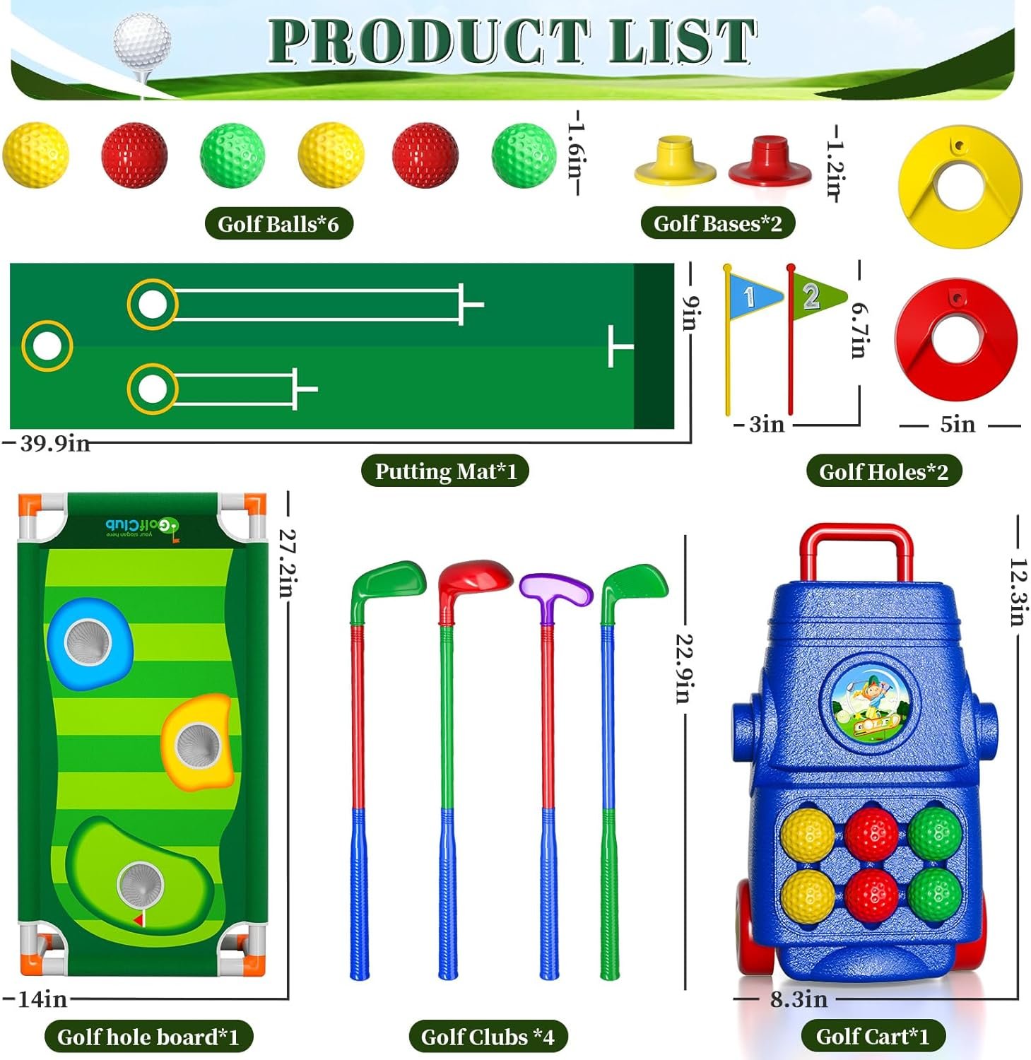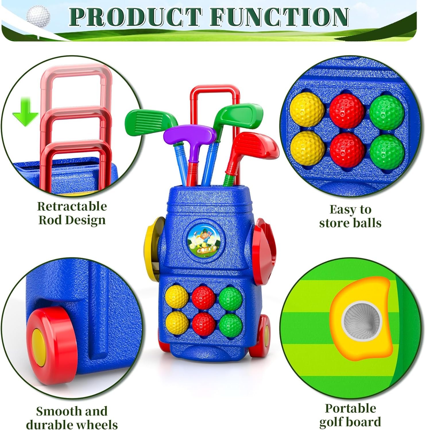 Upgrade Golf Club Set Toy – Complete Golf Play Set Comes with Kids Adjustable Pull Rod Golf Cart with a 2 Wheels for Easy Mobility, 4 Colored Golf Clubs,6 golf balls, 2 practice holes, a Putting Mat& 2 bases, 2 Flag.Which is designed for 3-6 years old toddlers to get in some golf practice.