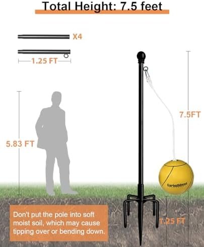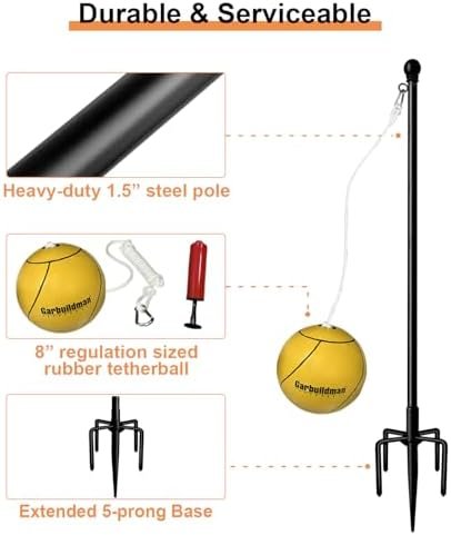 Upgrade with Stronger Grip: 15-inch extended 5-prong base provides this tetherball pole set with stronger support. Made of durable and high-quality metal, including sturdy 1.5” thick poles, 8″ regulation sized rubber tether ball with pump and a reliable base, ensuring a long service life without worrying about damage or wear and tear.