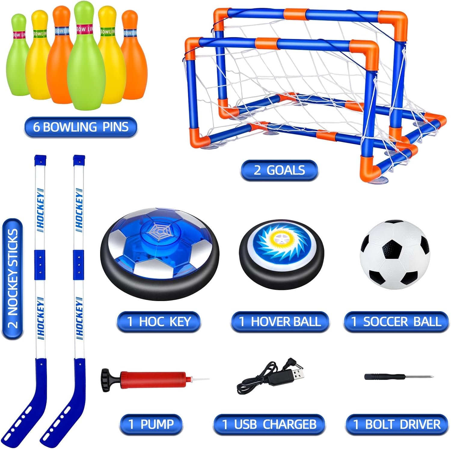 4-In-1 Indoor & Outdoor Game: 4 different kinds of sports toys in total. Includes 1 rechargeable hover soccer ball, 1 hockey ball, 1 inflatable soccer, 6 bowling pins, and comes with 2 goals. For those sports-loving kids, they can have hours of fun and release excess energy.
