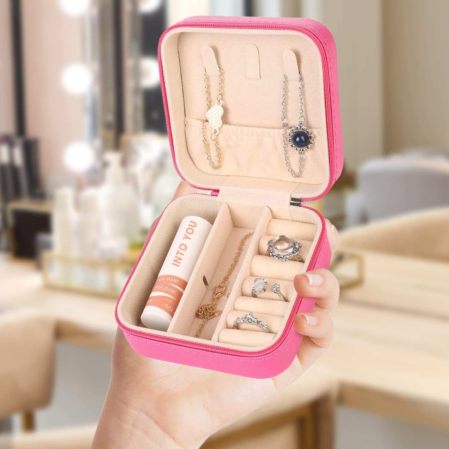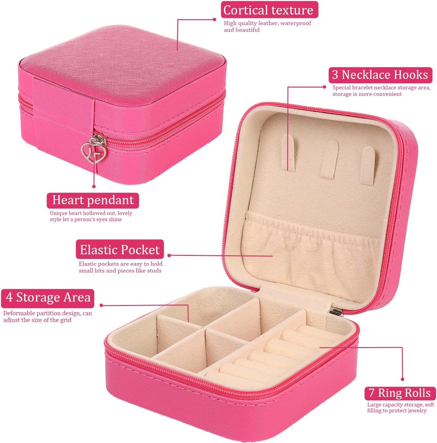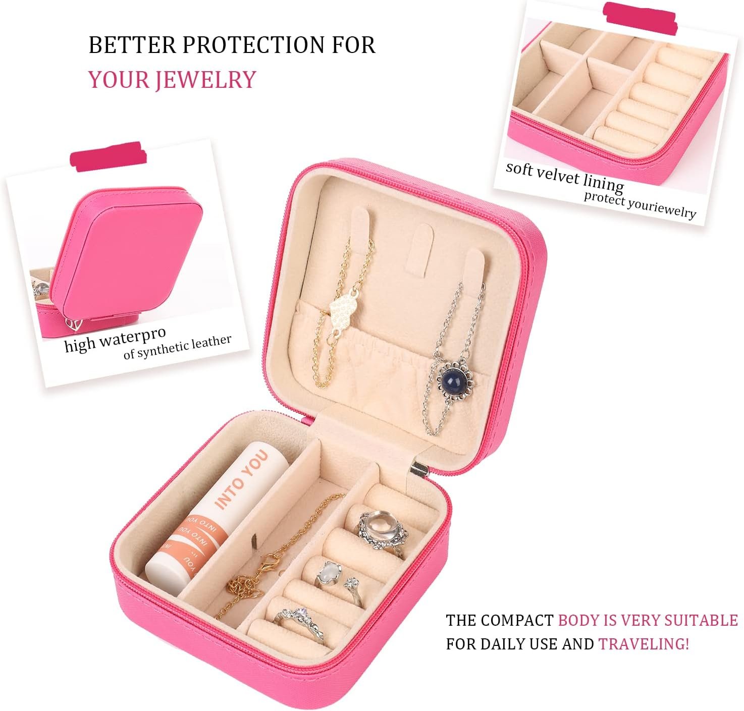 【All-IN-ONE Place】 This travel jewelry organizer box includes 3 necklace hooks ,a elastic pocket and 4 divided compartments for storage watches, necklaces, rings,earrings, lipsticks, earrings and other small precious pieces.