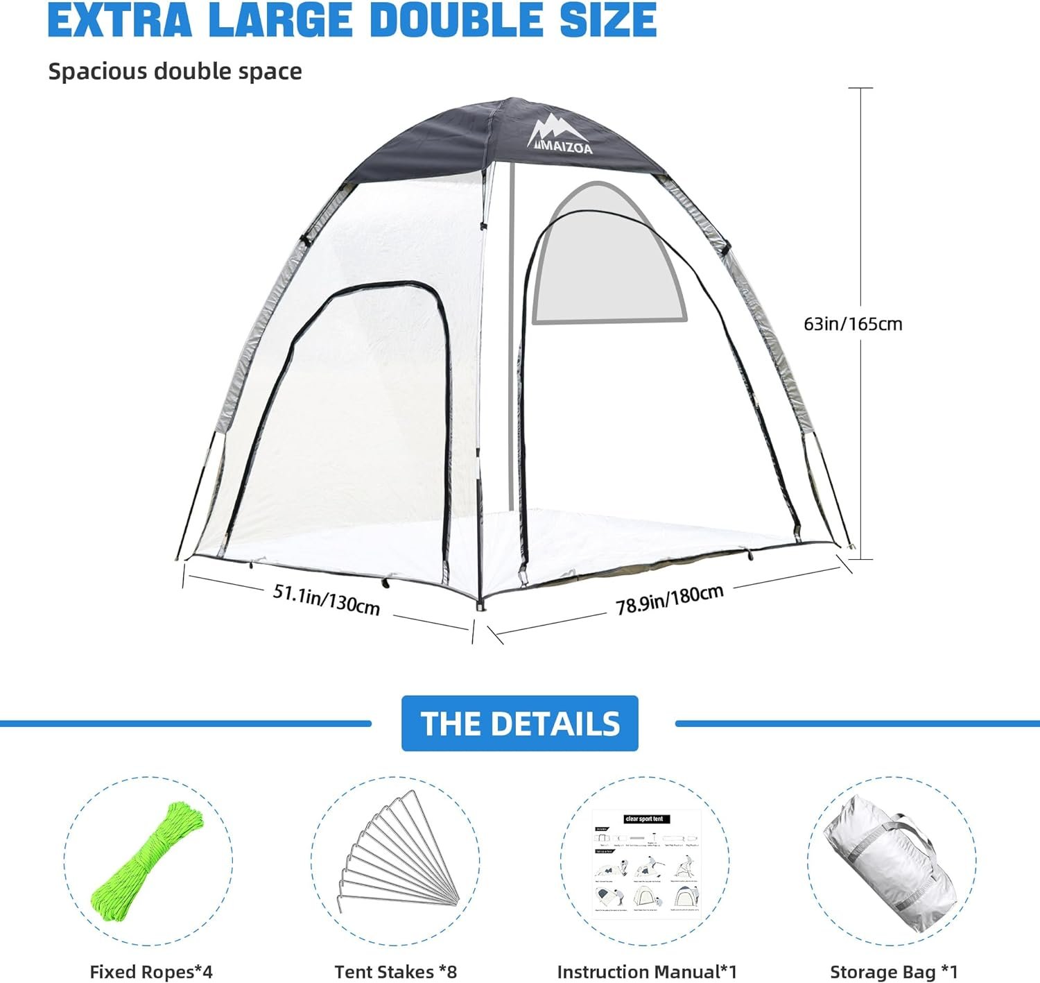 【Unrivaled Spacious Comfort】 Welcome to our double bubble tent, measuring 78.9in/180cm*51.1in/130cm*63in/165cm. Compared to regular bubble tents, ours is more expansive, providing an incredibly comfortable space.