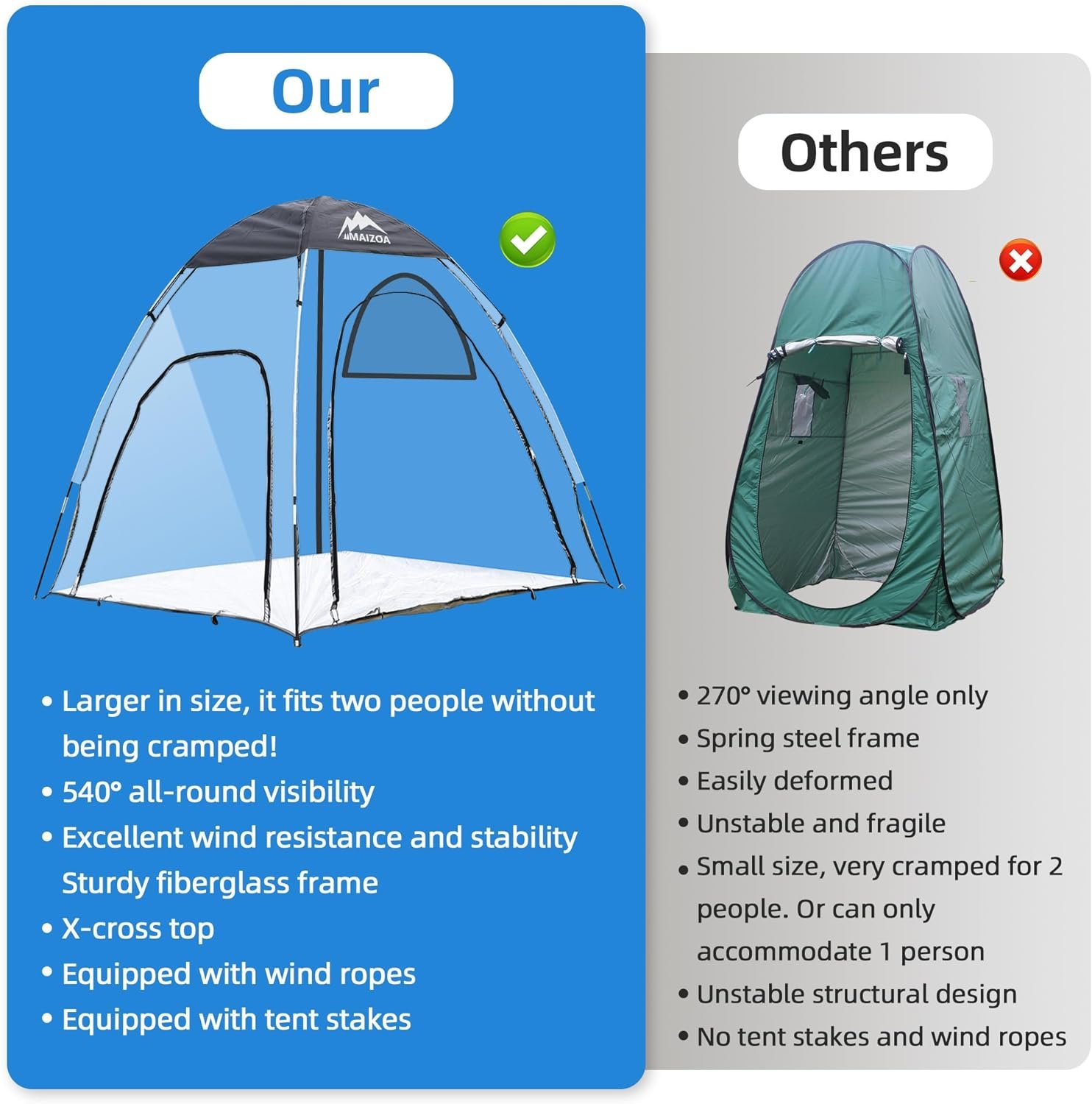 【X-Cross Stable Structure】 Crafted with a robust fiberglass frame and weather-resistant fabric, it’s easy to assemble and more stable and durable than traditional pop-up tents. The product comes with 4 wind ropes and 8 ground stakes to secure the tent firmly to the ground, ensuring optimal stability.